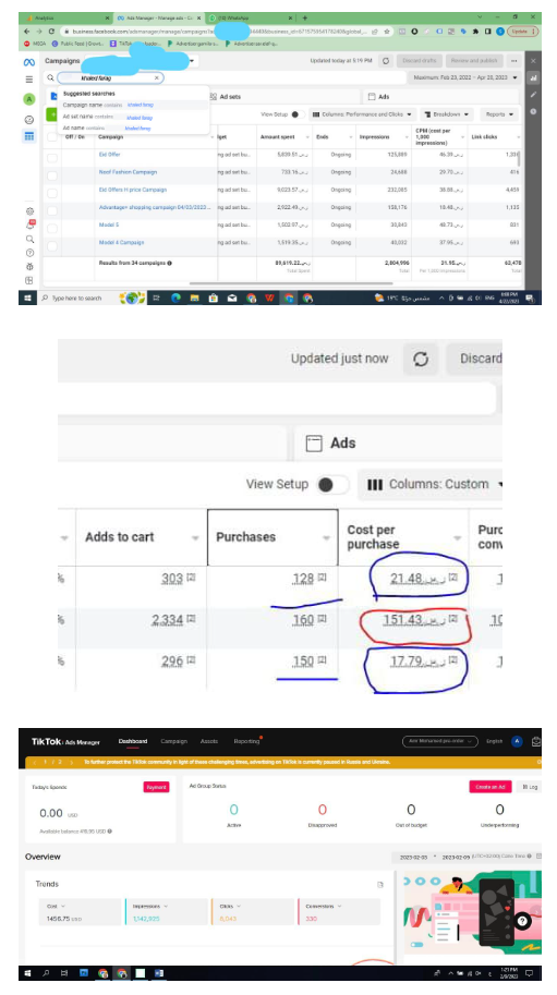 purchase : ( Instagram 438 - Tiktok 330 ] clicks : ( Instagram 63.478 - Tiktok 8.034 ] coast : ( Instagram 89.619 SAR - Tiktok 1.465 $ ]