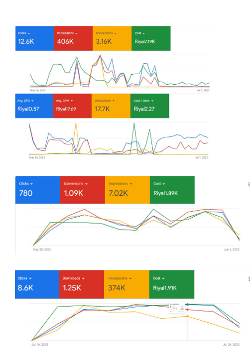 Search campaign : (clicks 12.006 - conversions 406.000 - coast 7.190) performance max campaign : ( clicks 780 - conversions 1.090 - coast 1.890 ) App install campaign : ( clicks 8.060 - app downloads 1.250 - coast 1.910 )